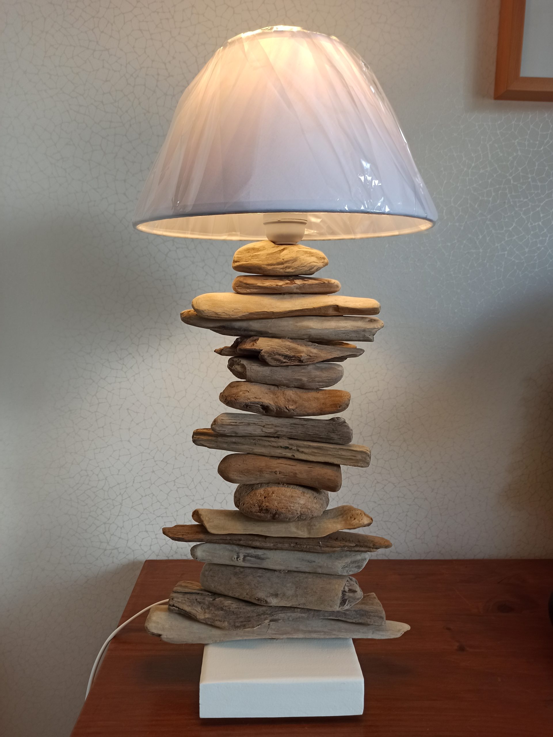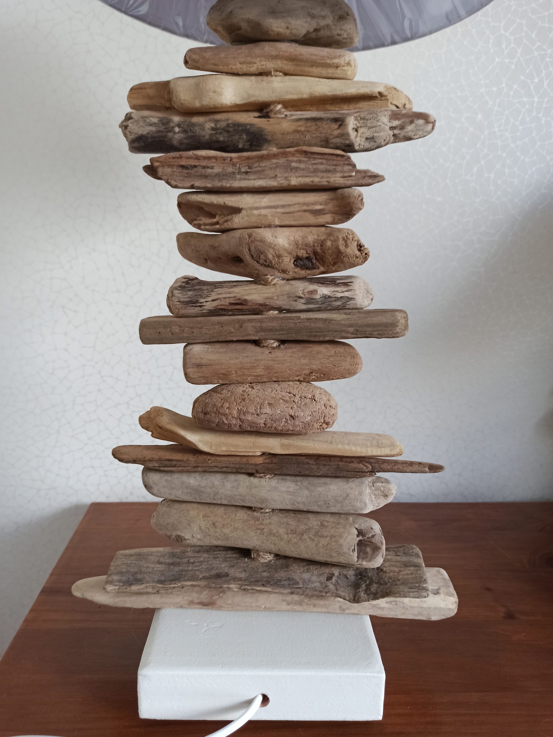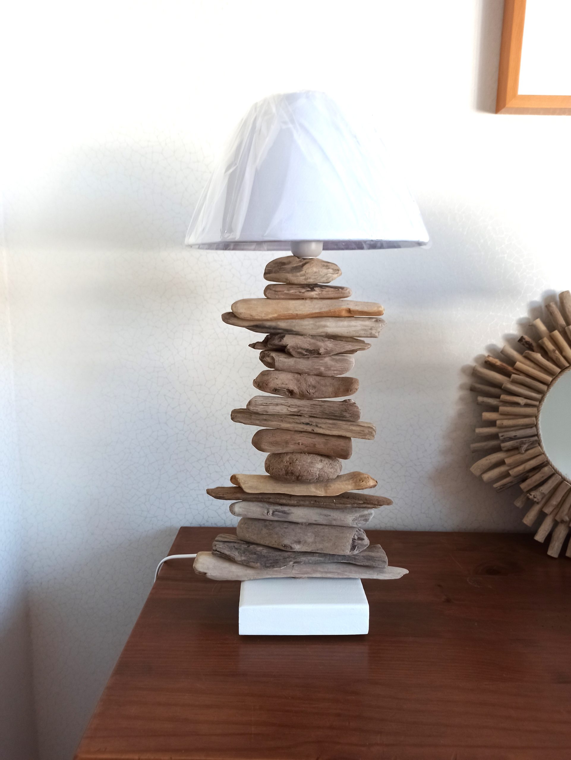 Cette lampe artisanale en bois flotté est réalisée à partir de pièces naturelles ramassées sur les plages de Biscarrosse, puis assemblées à la main pour créer une silhouette unique.