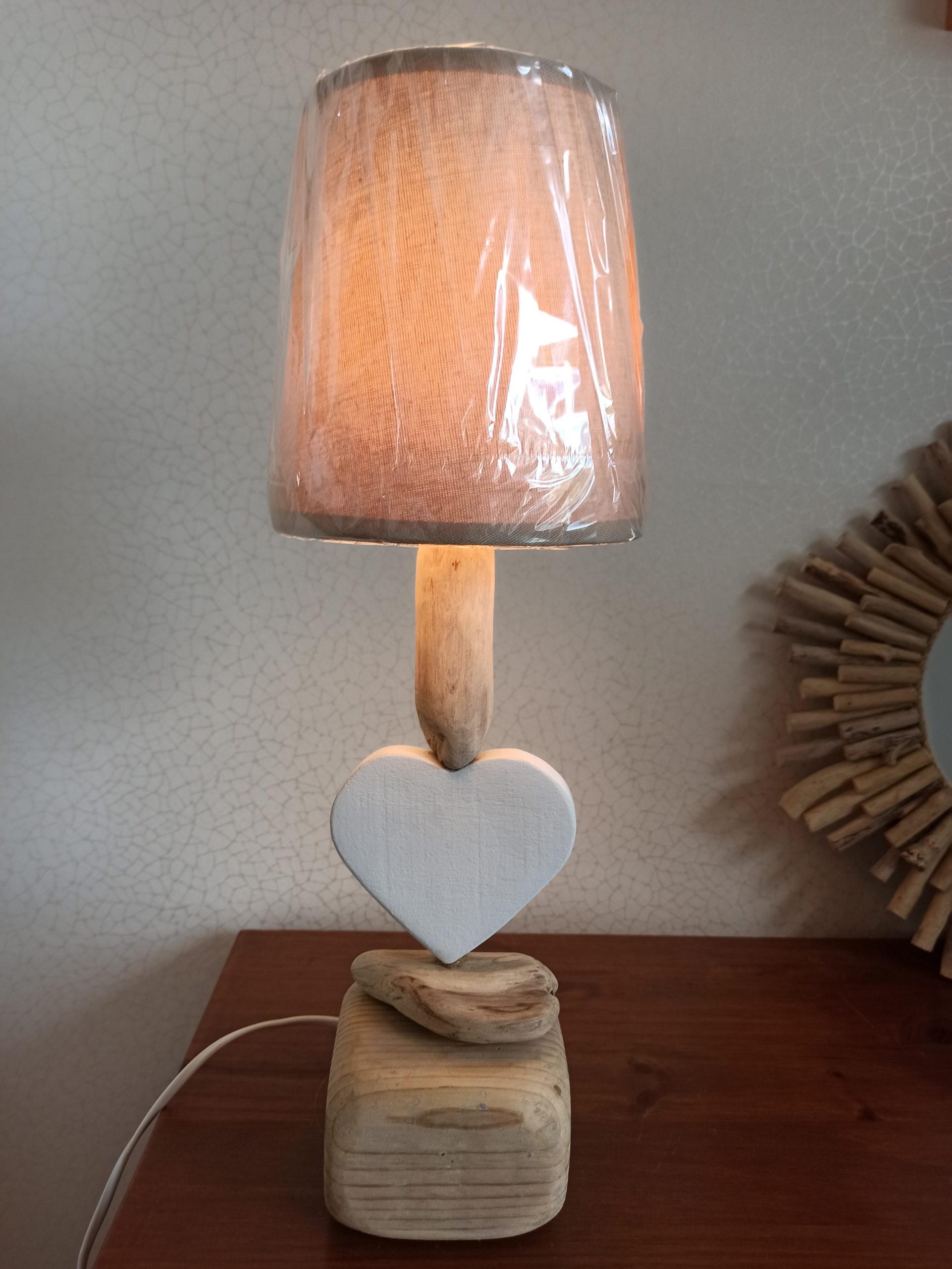 Au centre, un cœur en bois peint en blanc, symbole de douceur apporte une touche romantique. Son abat-jour beige complète l’ensemble avec simplicité, pour une lampe chaleureuse idéale pour une déco naturelle ou bord de mer.